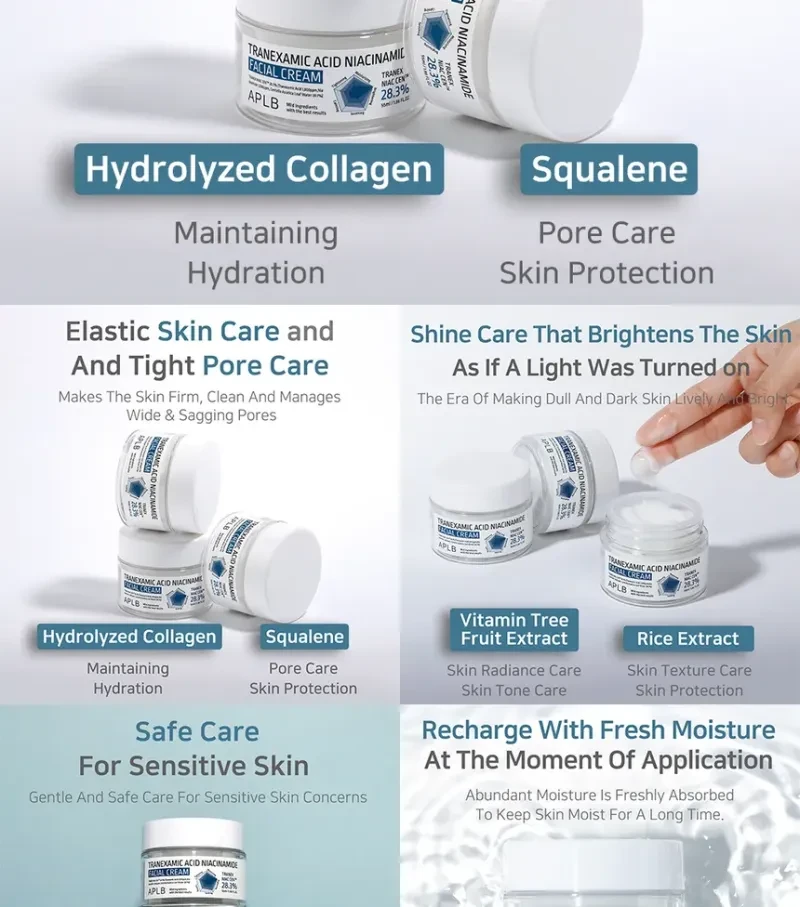 -This cream contains Tranexamic Acid, Niacinamide, and Centella Asiatica that offers refreshing moisture recharge to dry skin.